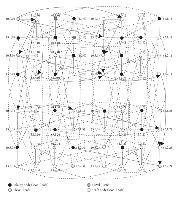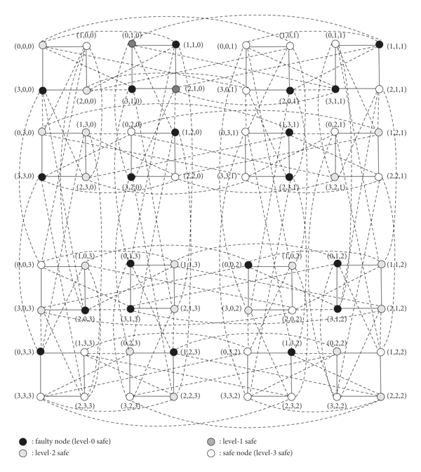 Definition 2. (see [32, 33]). The safety level of the is defined as follows:(1)A node in a hypercube is locally unsafe corresponding to a subcube if it has at least two faulty neighbors or at least three locally unsafe or faulty neighbors inside . Otherwise, it is locally safe corresponding to . A subcube is fully unsafe if it contains no locally safe node; otherwise, it is a safe subcube.(2)Locally unsafe nodes corresponding to a subcube is classified as follows: A locally unsafe node is called locally level-2 safe if it has at least one locally safe neighbor (level-3 safe) inside ; otherwise, it is a locally level-1 safe node.(3)A node in a hypercube is locally unsafe inside an if it has at least 2 faulty neighbors or at least 3 locally unsafe or faulty neighbors inside the ; otherwise, it is locally safe in the . The is unsafe if it contains no locally safe node (level-3 safe); otherwise, it is a safe . Locally unsafe nodes inside an are classified as a locally unsafe node is level-2 safe if it has at least one locally safe neighbor (level-3 safe) in the ; otherwise, it is a level-2 safe node.(4)An -dimensional subcube is defined as a maximal safe subcube if it is safe and any -dimensional subcube that contains it is fully unsafe.
