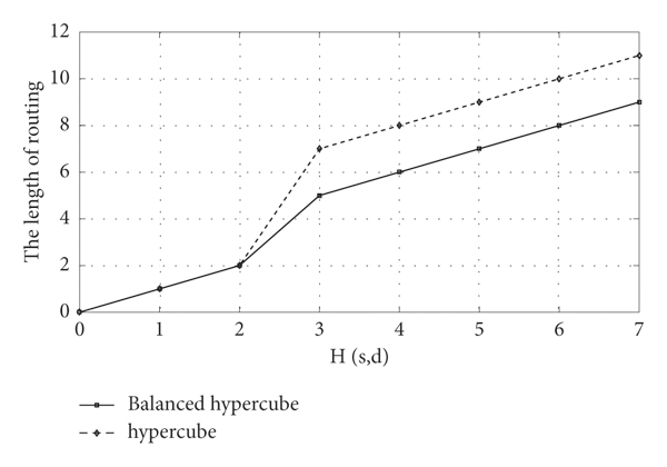 Xiang [32] proposed that the length of fault-tolerant routing is no more than in a faulty hypercube, where represents the Hamming distance from the source node to the destination node . In this paper, we use the local safety level to propose and prove that, in a faulty balanced hypercube, if there is a neighbor node of which satisfies the conditions in Section 5, and it appears on the shortest feasible path, we send messages in a minimum feasible path whose length is . On the contrary, if neither condition is satisfied, we choose an appropriate nonminimum path to send the messages form to and the length of this fault-tolerant routing is at most by calculating. Thus, we can know that the length of all paths for sending a message is no more than . Specifically, when , the length of fault-tolerant routing is equal to whether it is in hypercube networks or balanced hypercube networks, however, when , the length of fault-tolerant routing in balanced hypercube networks is two hops less than that in hypercube networks. It shows that the message routing in an injured balanced hypercube network is more efficient than that in an injured hypercube. This indicates the balanced hypercube is more suitable for increasingly complex network fault-tolerant routing.