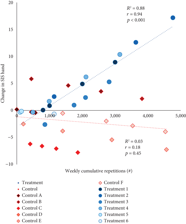 SIS Hand domain scores were comparable between the two groups at baseline ( for the treatment , control ; ). The primary linear mixed model analysis showed that the change in SIS Hand was affected by the HEP adherence differently for the two groups ( for the interaction effect). Specifically, greater weekly cumulative repetitions in HEP resulted in greater improvement of SIS Hand in the treatment group (Pearson ; ; ), while there was no improvement observed in the control group (Pearson ; ; ) (Figure 3). Final SIS Hand domain scores were for the treatment group and for the control group.